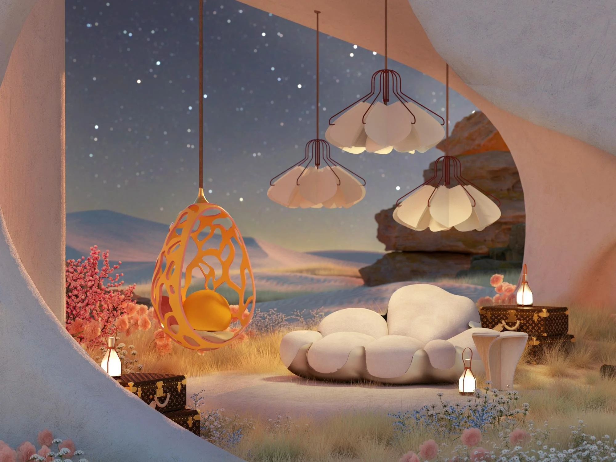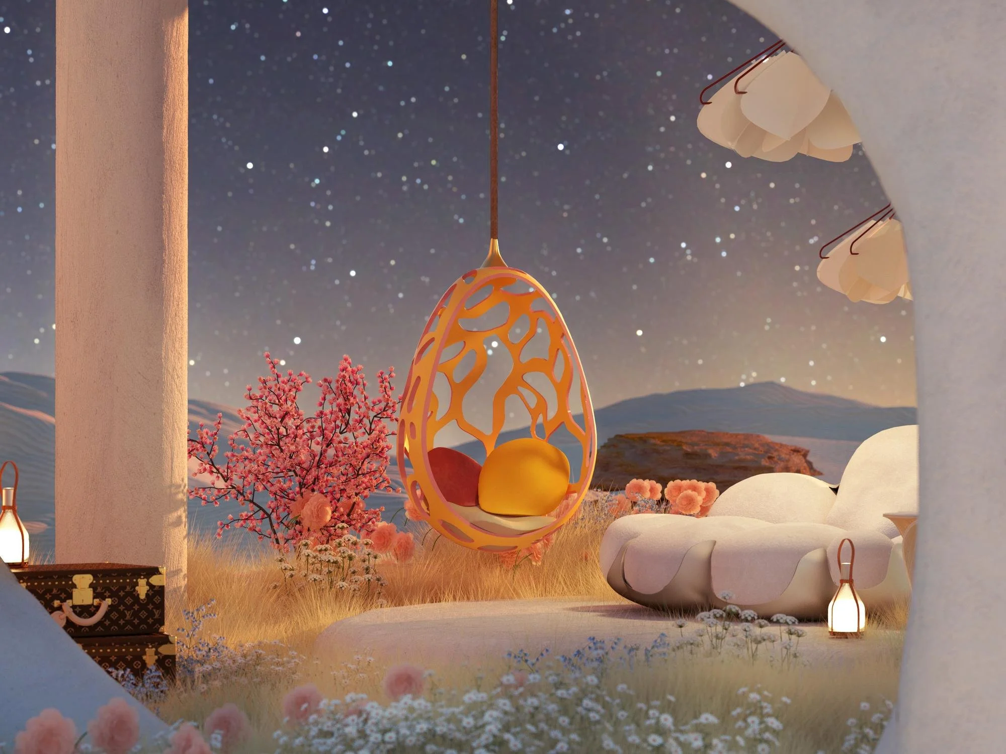 We created a series of surreal architectural renderings and dreamspace interiors featuring furniture pieces from Louis Vuitton’s Objets Nomades collection. In developing the space, we went through an extensive exploratory phase to craft a surreal yet realistic visual language that translates a sense of travel, discover and wanderlust.